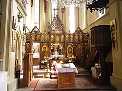 Пресвитерий На северной стороне конца церкви находится вход до ризницы, построенной в псевдо-готическом стиле. Ризница прямоугольная и имеет простой цилиндрический свод. Свод пресвитерия традиционно с одним полем прямоугольного крестового свода с ребрами в передней части и sestipaprscitou klenbou в конце. В пресвитерии обычные грушевидные ребра. В западной части церкви ораторский балкон, также в псевдо-готическом стиле от архитектора Грубера. Он доступен с первого этажа широкой аркады. В западной стене пробит вход в башню, в которой проходит винтовая лестница. Грушевидные ребра нефы дважды vyzlabena pasy отделяющими восточную и западную часть. В оратории находится нео-готический портал, ведущий к часовне Девы Марии Болестне. Часовня относится к времени Грубера.