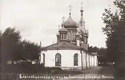 В 1903 году на строительство подворья Пекинской духовной миссии было отпущено безвозмездно с местной лесопилки дерево. Строительным комитетом руководил князь С. Н. Хилков, инициаторами строительства были чаеторговец Илья Чистяков (1857—1922), А. Г. Бороздин и др. Строители, не осведомлённые в церковном строительстве, ориентировали её в южную сторону, а не на восток[2]. Выстроенный храм Благовещения Пресвятой Богородицы погиб во время пожара, произошедшего 10 февраля 1918 года. По воспоминаниям священника Николая Падерина: «Пожар в старом Благовещенском храме был настолько силён, что железные и другие металлические предметы и детали расплавились, вся церковная утварь сгорела, стены изнутри рухнули, а снаружи кирпич местами развалился. Целиком устояла только южная алтарная стена, где под стеклом невредимо стоял образ Благовещения Божией Матери. Святой образ величественно, как „нерушимая стена“ стоял среди развалин и как-то особенно торжественно выглядел над беспорядочной грудой тлевших угольев и раскаленных металлических слитков»[3].