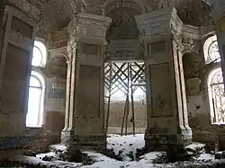 Грани, обращённые к интерьеру церкви, имеют ниши, в которых размещалась станковая живопись. Над большими нишами — малые, с рельефными изображениями ваз. Пилоны завершаются антаблементом, фриз которого декорирован окантами и розетками. По основанию купола проходит профилированный карниз. Над западным дверным проёмом, под подпружной аркой хоры, с заложенной дверью. Помещения южного и северных приделов имеют плоские перекрытия. В притворе, центральная часть его перекрыта полуциркульным сводом, помещение в северной части имеет плоское перекрытие, в южной части деревянная лестница, ведущая на ярус звона и чердак. Над алтарём корытчатый свод, расписанный масляной живописью. Строительный материал — кирпич. Габариты : 29×34 м. Диаметр ротонды — 19 м. Внутреннее убранство не сохранилось. Иконостас к. XVIII в. вывезен в Псковский музей-заповедник в 1974 г.