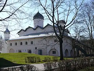 При последней реставрации кровельное покрытие было устроено из лемеха, что в XVI веке было весьма характерной деталью новгородских построек.