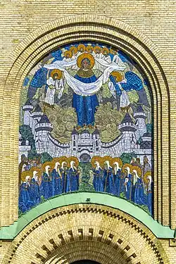 В 1906 году Николай Рерих выполнил 12 эскизов мозаик и росписей, однако, реализованы были только две мозаики — «Спас Нерукотворный с избранными святыми» и «Покров Пресвятой Богородицы».