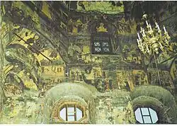 В зените свода изображен царь царей. На гранях свода изображены праздники. На сводах восьмерика и четверика, разделённых на шесть регистров — сюжеты христологического цикла, апокрифические легенды об иконе Римской богоматери и деяния апостолов. Два нижних пояса четверика забелены.