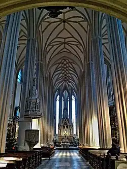 Исходя из археологических находок можно утверждать, что в конце XIII начале XIV веков романская церковь была заменена на готическую, примерно того же размера, что и существующая сейчас. Но, по не понятным причинам, и она была почти полностью без каких либо остатков снесена и заменена на тот храм, что мы можем видеть сейчас. Так же в это время было основано множество алтарей, например св. Вита (1413), свв. Филиппа и Иакова (1423) или св. Анны (1446).