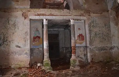 Храм имел два престола: главный во имя Спаса Нерукотворного Образа и придельный во имя Тихвинской Иконы Божией Матери[3].