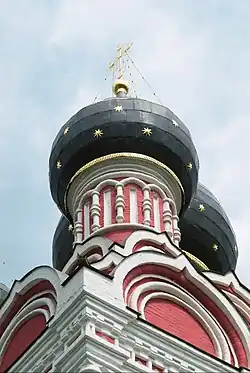 Пятиглавый храм в стиле русского узорочья поставлен на высокий подклет и имеет увеличенные формы, благодаря чему вмещает до трёх тысяч человек. Главный четырёхугольный объём декорирован тремя сплошными рядами кокошников, на которые поставлены пять глав с куполами. В нижней части к нему примыкает обходная галерея, с запада он объединён с трапезной и двухъярусной колокольней[8][18]. Изначально в трапезной был оборудован переход в Путевой дворец, заложенный позднее. Для удобства царской семьи в северной стене помещения обоустроили проход в закрытые моленные царя и царицы, декорированные сохранившимися изразцовыми печами и резными деревянными подсвечниками[6][8]. Настенные росписи главного храма выполнили в первой половине XIX века артелью художников, предположительно под руководством Джованни Скотти[4][19]. Тихвинская икона Божией Матери расположена в местном ряду иконостаса середины XVII века под специальным навесом[18]. Также в церкви хранятся икона Богородицы «Прибавление ума», крест с частицами мощей Николая Чудотворца и точная копия пещеры Гроба Господня[9][12][16].