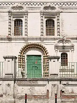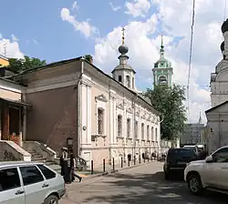 Вдоль красной линии переулка расположен южный фасад четырёхстолпной сводчатой трапезной, соединённой с основным зданием церкви, но воспринимаемой как самостоятельный объём. Учащенный ритм пилястр, раскреповка цоколя и карниза, большие окна в наличниках с «ушками» и выступающими треугольными фронтонами, ложные окна цокольного этажа, соответствующие верхнему ряду окон — всё это придает фасадам трапезной чрезвычайную нарядность и пластическую насыщенность. С запада от здания церкви вместо колокольни во всю ширину торца расположен притвор (нынешний построен около 1880 г.), выделенный на боковых фасадах более широким членением.