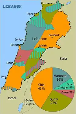 Ливан является одной из двух стран Ближнего Востока (другая — Республика Кипр), в которой христианская община является государствообразующей. В 1932 году христиане составляли 55 % населения Ливана, однако к концу века их число снизилось[1]. Это связано с тесной взаимосвязью местных христиан с Римом и Францией. Большинство христиан в Ливане — марониты. Остальные христиане представлены греческой и армянской общинами.