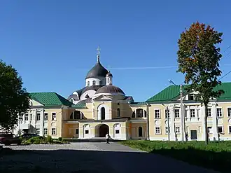 Монастырский ансамбль в стиле классицизма сложился в первой половине XIX века. Первоначальные средства на строительные работы поступили от графини Анны Иродионовны Чернышёвой. На них была возведена надвратная церковь, а также игуменские покои с ризницей и трапезной. Нельзя исключать, что проект этих зданий подготовил Н. А. Львов.