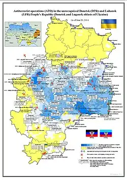 Секретарь Совета национальной безопасности и обороны Украины Андрей Парубий 4 июля заявил, что силы АТО взяли под свой контроль 23 из 36 районов в зоне АТО[53].