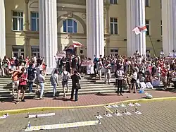 6 августа запланированный митинг Светланы Тихановской в Киевском сквере в центре Минска был отменён из-за проходившего там же концерта[89]. Собравшиеся на митинг Тихановской скандировали «Жыве Беларусь!» (с бел.«Да здравствует Белоруссия!») и «Уходи!». В поддержку собравшихся людей звукорежиссёры Кирилл Галанов и Владислав Соколовский поставили песню Виктора Цоя «Перемен!». Позднее они были задержаны и осуждены на 10 суток административного ареста за «хулиганство» и «сопротивление работникам милиции»[90][91]. Также был арестован руководитель предвыборного штаба кандидата в президенты Сергея Черечня[92]. В центре Минска, на проспекте Независимости, водители провели акцию протеста в поддержку задержанных звукорежиссёров. Въезд на проспект был перекрыт[93].