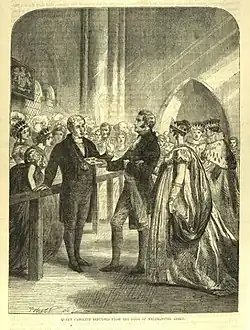 Королева Каролина, отброшенная от дверей Вестминстерского аббатства, гравюра из «Иллюстрированной истории Англии» (1865), том VII, на которой королева держит лорда Худа под руку