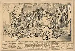 Сатирическая гравюра 1821 года, изображающая сторонников королевы Каролины: Генри Худ — фигура на крайнем правом фланге[18]