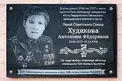 За время войны заместитель командира эскадрильи 46-го гвардейского ночного бомбардировочного авиаполка (325-я ночная бомбардировочная авиационная дивизия, 4-я воздушная армия, 2-й Белорусский фронт) А. Ф. Худякова произвела 926 боевых вылетов на бомбардировку войск противника, скинула 130 тонн бомб, уничтожила 3 склада, 12 машин, 2 переправы, 1 железнодорожный состав, 4 батареи[2].