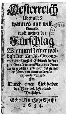- Philipp Wilhelm von Hörnigk: Oesterreich über alles, wann es nur will. das ist: wohlmeinender Fürschlag, wie mittelst einer wolbestellten Lands-Oeconomie, die Kayserl. Erbland in kurzem über alle andere Staat von Europa zu erheben, und mehr als einiger derselben von denen andern independent zu machen. 1684. Faksimile-Ausgabe: Verlag Wirtschaft und Finanzen, Düsseldorf 1997