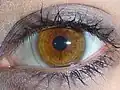 Жёлтые глаза имеют монотонную светлую жёлто-коричневую окраску. Иногда они характеризуются золотисто-зелёным либо красновато-медным оттенком. Это обусловливает пигмент липофусцин (липохром), содержащийся также в зелёных глазах[31][32]. Жёлтый цвет глаз встречается крайне редко. Это случается только тогда, когда сосуды радужной оболочки содержат пигмент липофусцин (липохром) очень бледного цвета[33]. Это может свидетельствовать о наличии инфекции в организме человека.