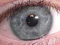 Определение серых и голубых глаз схоже, только при этом плотность волокон внешнего слоя ещё выше и их оттенок ближе к серому. Если же плотность не так велика, то цвет будет серо-голубой. Наличие меланина или других веществ даёт небольшую жёлтую или коричневатую примесь. Серый цвет, предположительно, связан с рассеянием Ми на волокнах внешнего слоя, которое, в отличие от рэлеевского, менее зависит от длины волны; как следствие — спектр отражённого от радужной оболочки света ближе к спектру источника, чем в случае синих или голубых глаз[21].