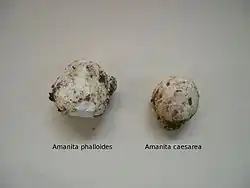 Бледная поганка и цезарский гриб в стадии «яйца»