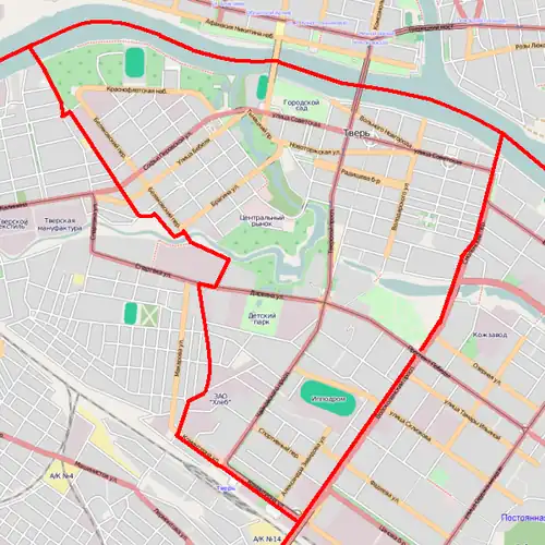 - ↑ Описание границ между районами города содержится в веб-архиве старой версии официального сайта города Твери на странице Устав города. Приложение 1. Границы и состав территорий города Твери. Архивировано из оригинала 8 января 2002 года. — со ссылкой на решения горисполкома от 7 января 1965 года № 9 и от 30 декабря 1975 года № 253 (проверено 30.09.2009) и отображена на некоторых картах и атласах.