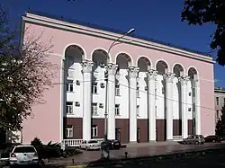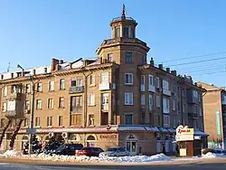 Застройка центра велась в русле парадной монументальной архитектуры того времени. Одними из первых выросли «дома со шпилем», которые были выполнены в стиле сталинского ампира. Подобные ансамбли наблюдались по всему Советскому Союзу (сталинские высотки, гостиница «Украина» в Киеве, дом со шпилем на площади Конституции в Харькове).