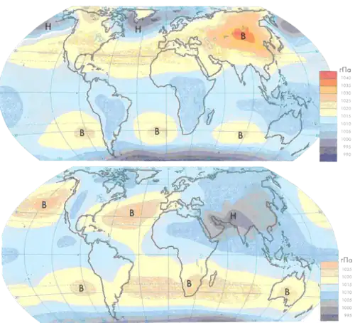 К перманентным центрам действия атмосферы относятся экваториальная депрессия, субтропические антициклоны, океанические депрессии субполярных широт, полярные антициклоны (особенно антарктические). К сезонным — зимние антициклоны и летние депрессии над материками в средних широтах.