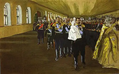 Осенью 1906 года Кустодиев получил неожиданный заказ от командования лейб-гвардии Финляндского полка на тему предстоящего празднования 100-летия этой части императорской гвардии. Художнику было поручено написать большие портреты основателя полка Александра I и нынешнего императора Николая II, а также картину со сценой церковного парада и первого представления полку его шефа, цесаревича Алексея, состоявшихся 12 декабря 1905 года в Царском Селе[1][2]. Шефом «финляндцев» цесаревич Алексей был назначен спустя год после своего рождения, 30 июля 1904 года, что было отмечено в полку целым рядом торжественных мероприятий[2]. В их число, как записал в своём дневнике великий князь Константин Константинович, вошёл и «прошлогодний церковный парад в полку в Царскосельском манеже, когда Государь, обойдя строй, нёс на руках Шефа полка, маленького Цесаревича. В толпе идущих с Государём находился и я»[3]. Николай Воронович, бывший в то время воспитанником Пажеского корпуса, праздник учреждения которого отмечался «высочайшим смотром» и приходился на один день вместе с Финляндским полком, писал, что «после 1905 года парады эти были перенесены в Царское Село, в манеж лейб-гвардии Гусарского полка. Публика на них не допускалась, парады эти не отличались большой торжественностью и не оставили о себе особых воспоминаний»[4].