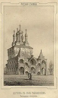 Церковь входила в состав дворцового комплекса путевого дворца. Подобные храмы были построены в других путевых резиденциях царя, Котельниках (по дороге в Коломну) и Алексеевском (также на пути в Троице-Сергиев монастырь).