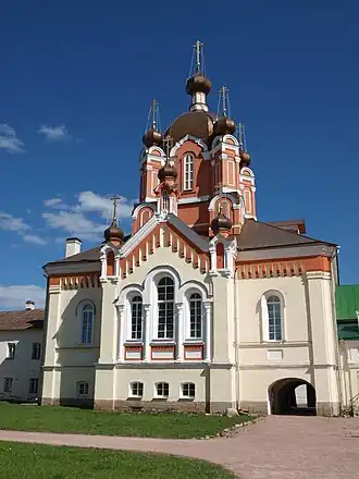 Первый храм, стоявший на этом месте, был возведён в 1699—1702 года в северо-восточной части келейных корпусов монастыря и назывался Покровским. В 1871—1877 годах старое к тому времени сооружение было капитально перестроено по проекту архитектора Николая Бенуа. Обновлённую церковь назвали в честь Воздвижения Креста Господня. Её увенчало новое высокое пятикупольные завершением эклектичной архитектуры. Основание церкви акцентировано центральным ризалитом со щипцом, венчающий карниз декорирован машикулями, перекликающимися с машикулями Никольской восточной воротной башни. Высокие полуциркульные окна придают основанию массивность. Над ним возвышается высокое пятиглавие с закомарами и малыми луковичными главками. Воротный проезд не акцентирован, расположен не в центре, а в южной части здания[1].