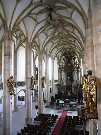 По представлению южнонемецкой поздней готики храм имеет одну башню, экстерьер выглядит просто и строго, стены гладкие и плоские с двумя поясами окон. Нижние окна относятся к отдельным часовням а верхний пояс окон относится к боковым нефам храма. Внутри храма большое пространство разделено тремя нефами, содержащими по 8 восьмигранных колонн без капителей. Между колоннами 16 часовен, 2 боковые прихожие, ризница, восточная двойная лестница и западная лестница. Каждая часовня имеет свод. Отдельные позднеготические своды имеют чисто декоративные нервюры.