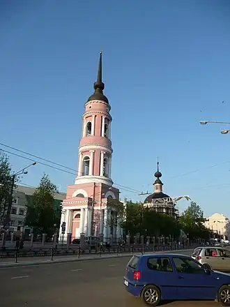 16 марта 1798 года от алтаря прежней церкви была начата постройка нового здания по плану губернского архитектора Ивана Ясныгина. Трапезная была готова и покрыта тёсом уже в 1799 году. К июлю 1800 года в неё перенесли иконостас и утварь из прежней церкви и устроили придел во имя Казанской иконы Божией Матери, которая была спасена при пожаре 1767 году. Старое здание было разобрано и использовано в качестве материала для нового. Церковь была построена и украшена внешней отделкой в 1804 году. Второй придел во имя Сретения устроен и освящён в 1809 году. Храмовая икона этого придела была написана во время чумы в 1771 году и поставлена в Мироносицкую церковь, поскольку та была крайней в городе по направлению к Москве. Новое здание было освящено 15 апреля 1815 года епископом Евгением. С 1818 года начата постройка новой колокольни по плану губернского архитектора Соколова[1] (в других источниках Ф. П. Старикова[2] или Старичкова[3][4]). Из-за слабости грунта в её основание было вбито около 700 свай и положено 50 саженей камня. В 1820 году был окончен нижний ярус колокольни, второй ярус построен в 1830 году, а основные строительные работы завершены в 1833 году под руководством архитектора П. И. Гусева. Купол и железный шпиль с вызолоченными украшениями поставлены в 1842 году. В этом же году были сделаны архитектурные украшения трапезы, карнизы и фронтоны — все из белого камня. В 1851 году была сооружена западная паперть, на месте которой был проезд, и поставлена и каменная ограда с железными решётками[1]. Одновременно с внешними работами шла внутренняя отделка храма. В 1823 году был вызолочен иконостас, в который перешло несколько икон из старой церкви. В 1828 году была расписана трапезная; в 1836 году в Казанском приделе был устроен новый иконостас, а старый перенесён в часовню[5].