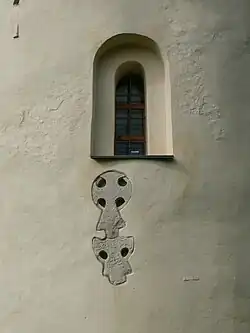 В стенах церкви имеется несколько каменных закладных крестов, типичных для новгородских церквей начиная с середины XIV века[7][8].