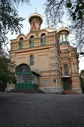 Церковь построена в русском стиле. Главная часть храма, почти квадратная в плане, увенчана большим круглым барабаном с массивной луковичнообразной главой и четырьмя небольшими круглыми барабанами с такими же луковичнообразными куполами.