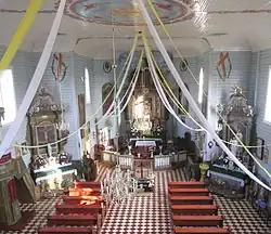В интерьере храма выделяются три деревянных барочных алтаря. Главный алтарь двухъярусный, находится на высоком постаменте, решён двумя колоннами коринфского ордера. В верхней части алтаря находится прямоугольный пилястровый щит с горельефным образом «Распятие», а в центре — икона «Богоматерь с младенцем» в барочной резной раме. Алтарь богато украшен деревянной резьбой с позолотой. Композиция и декор боковых алтарей повторяют центральный, но отличаются рокайльными фигурными щитами в завершении. Над нартексом — балюстрадная галерея хоров с органом[1][3].