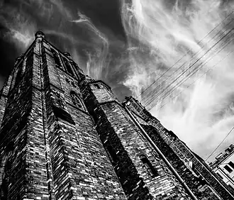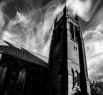 Башня церкви увенчана по углам четырьмя небольшими остроконечными пинаклями с флюгерами. Она никогда не являлась колокольней, так как колокола на ней так и не были установлены[7]. Нижняя часть башни — проходная, в которой имеется два входа с улицы: северный (главный вход) и восточный, а также выход в нартекс церкви. Главный вход по бокам украшен изображениями двух архангелов — Гавриила и Михаила. Потолок проходной состоит из крестового свода, образованного диагональными арками. На втором этаже башни находится бывший хоровой класс с выходом на хоры, на остальных этажах — служебные помещения, которые в настоящее время занимает не принадлежащая церкви библиотека, в которой находится около 10 тысяч книг по теологии, доступ к которым имеют христианские студенты-теологи.