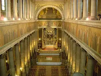 Обширные росписи нефа выполнены в технике энкаустики (в то время редко использовавшейся) по золотому фону[5]. Особое внимание обращает на себя 90-метровый живописный фриз, опоясывающий неф между двумя уровнями колонн. Он был создан в 1853 году художником Ипполитом Фландреном, на нём изображены 235 святых, шествующих в сторону алтаря[6]. В апсиде храма находится достроенная в 1869 году Капелла Пресвятой Девы, роспись которой выполнил в 1885—1889 годах Вильям Бугро[1]. Бронзовая скульптурная композиция «Голгофа» на главном алтаре создана знаменитым скульптором Франсуа Рюдом. Роспись свода апсиды, изображающая Христа на престоле, принадлежит Франсуа Эдуару Пико[6].