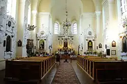 Храм отличается изяществом декорации интерьера, богато украшен бело-голубыми барельефами из стукко. Убранство храма напоминает убранство известного храма Петра и Павла в Вильнюсе, поскольку архитектор Пенс работал над интерьером церкви совместно с итальянским художником Пьетро Перти — одним из авторов скульптурных композиций вильнюсского памятника[5]. Барельефы выполнены в 1684—1700 годов группой иностранных декораторов под руководством Пьетро Перти с участием местного мастера Николая Жилевича, имя которого обнаружено в виленских архивах[6].