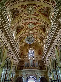 В интерьере центральный неф перекрыт цилиндрическим сводом с распалубкой на одиночных подпружных арках. Межнефные аркады поддерживают двойные подпружные арки. Аналогичные арки разделяют травеи боковых нефов. Стены декорированы фресковой росписью в технике гризайль, имитирующей скульптурную лепку. Над входом расположено панно с изображением двух воинов со щитами и воинскими атрибутами[8]. На парусах купола, торцовых стенах трансепта, в апсиде — скульптурные изображения евангелистов, святых и ангелов.