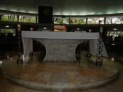 Внутренний интерьер украшают 15 фресок, изображающих события из жизни Иисуса Христа. Крест с изображением страдающего Христа и мраморный алтарь являются работами художника Наполеона Абуэвы. По работы Артура Луса расписан фреской, называемой «рекой жизни».
