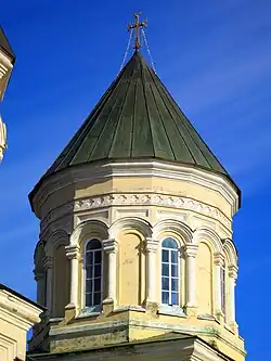 Колокольня квадратная, по ширине значительно меньше среднего нефа. Примыкающие в колокольне боковые помещения приподняты на уровень угловых отделений церкви.