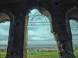 Барабан купола с пилястрами между узкими с полуциркульным верхом окнами и массивные устои звонницы колокольни придают тяжеловесность внешнему виду здания.