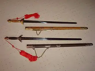 - навершие эфеса заканчивается кистью, которую можно обмотать вокруг запястья и ладони в качестве темляка[9]. Также кисть могла использоваться для впитывания крови, попавшей на рукоять[10]. Иногда встречается очень длинная кисть, сравнимая своей длиной с клинком, которая, как считается, должна отвлекать внимание противника[11]