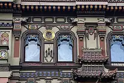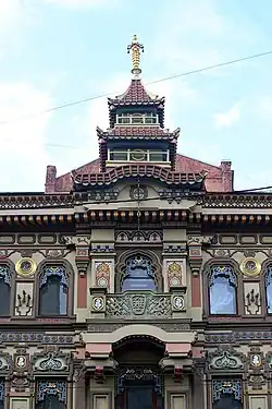 Доподлинно неизвестно, посещал ли Гиппиус Китай, но искусствоведы отмечают, что ему удалось крайне точно воспроизвести народные мотивы. Архитектор сохранил симметричную композицию существующей постройки, наделив её яркими выступающими объёмами кровель. Парадный вход в магазин был выполнен из тёмно-фиолетового мрамора, а портал над дверью украшали морды животных и рельефное панно с позолоченным павлином[15][10]. Фасад здания был отделан обилием скульптурных деталей и керамических плиток, выполненных на заказ китайскими мастерами. Основной темой декоративных элементов стали мифические животные[11][16][17]. Фронтон дома венчала двухъярусная башенка-пагода, увешанная маленькими колокольчиками. В филёнках над витринами архитектор расположил стилизованные под иероглифы вывески, а над дверным проёмом находилась надпись: «Сергей Васильевич Перлов — главный магазин»[18][1][19].