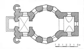 Внутреннее пространство основного объема представляет собой круглый зал, перекрытый закрытым куполом, не сохранившимся до нашего времени. Стены усеяны рифлеными пилястрами и отделаны профилированными карнизами с сандриками . Входной объем перекрыт крестообразным сводом, а алтарная часть перекрыта цилиндрическим сводом . Последний открыт в основной объем арочным сводом, как и хоры, расположенные на втором этаже притвора.