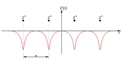 Рассмотрим одномерную решётку ионов, расстояние между которыми . Потенциал при этом будет периодическим. Рассмотрим сначала идеализированный случай бесконечного кристалла. Уравнение Шрёдингера имеет вид:
