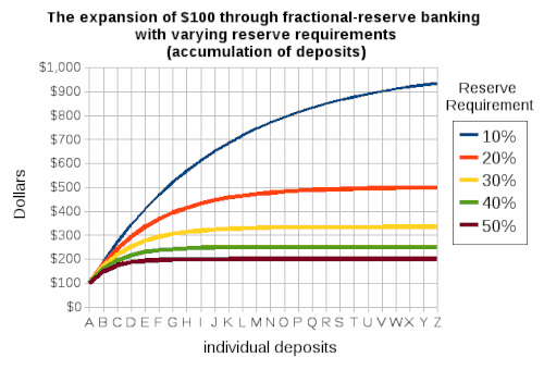 Когда наличность отдаётся на хранение в банк, лишь некоторая часть этих средств удерживается в качестве резерва, а оставшаяся часть может быть выдана в виде кредита (или потрачена банком на покупку ценных бумаг). Деньги, выданные или потраченные подобным образом, впоследствии размещаются на хранение в другом банке, тем самым создавая новые депозиты и позволяя снова выдавать их в кредит. Кредитование, повторное депонирование и повторное кредитование денежных средств увеличивает денежную массу в стране. Из-за повсеместного частичного банковского резервирования денежная масса большинства стран во много раз превосходит денежную базу, созданную центральным банком страны. Такое умножение (называемое денежным мультипликатором) ограничивается нормой обязательных резервов или требованиями других финансовых коэффициентов, предписанных финансовыми регуляторами[5][6].