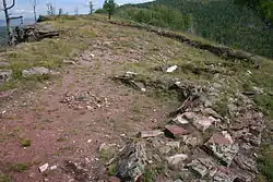 Крепость имеет две линии оборонительных стен, сооружённых из плит песчаника. Первая, внешняя, отсекает подход по седловине от соседней вершины к участку вершины горы размерами 160 на 170 м. Общая длина первой, внешней стены — 210 м. На момент исследований высота стены доходила до 1,8 м, на сегодняшний день высота стены доходит до 1,5 м, при этом кладка стен прекрасно сохранилась. Внутренняя стена крепости ограничивает небольшой участок вершины, являвшейся цитаделью. Территория между стен имеет сильный наклон и не имеет следов использования, поэтому считается, что внешняя стена возникла не в процессе расширения крепости, а одновременно, как единый комплекс с цитаделью. Внутри цитадели, вплотную к стене, археологически выявлена полуземлянка размером примерно 4 на 15 метров. В западной части так же вплотную к стене пристроены две небольших хозяйственных постройки или загородки из камня, овальной и прямоугольной в плане формы размерами 4×5 м и 4×6 м. Культурный слой построек содержал многочисленные кости животных, фрагменты керамики и вещественные находки. Анализ материалов раскопок не позволяет интерпретировать эти сооружения как бытовые жилые комплексы.