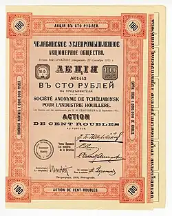 Челябинское углепромышленное акционерное общество было зарегистрировано в Санкт-Петербурге в 1911 г. (Устав Высочайше утвержден 22 сентября 1911 г.) для промышленной эксплуатации угольных рудников, расположенных к востоку от Уральского хребта. Основной капитал компании определялся в 1 млн. руб. разделенных на 10 тыс. акций по 100 руб. каждая.[3]