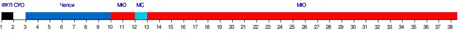 | 3 | Челси | 38 | 22 | 9 | 7 | 75 | 39 | +36 | 75 | |||