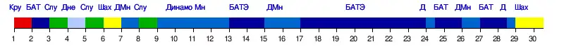 | 15 | Славия-Мозырь | 30 | 4 | 8 | 18 | 26 − 50 | −24 | 20 | |