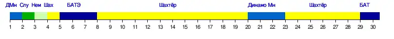 | 1 | Шахтёр (Солигорск) | 30 | 21 | 3 | 6 | 71 − 23 | +48 | 66 |