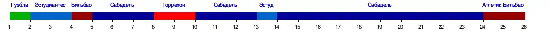 | Атлетик Бильбао | 3 | 2 | 2 | 1 | 2 | 3 | 3 | 3 | 3 | 3 | 4 | 3 | 5 | 5 | 2 | 2 | 2 | 2 | 2 | 2 | 2 | 2 | 2 | 1 | 1 | 1 |